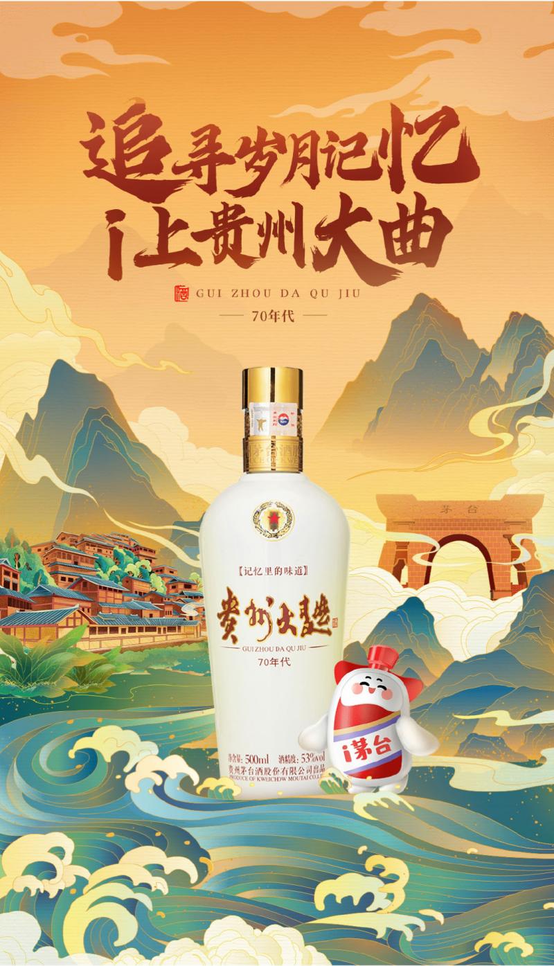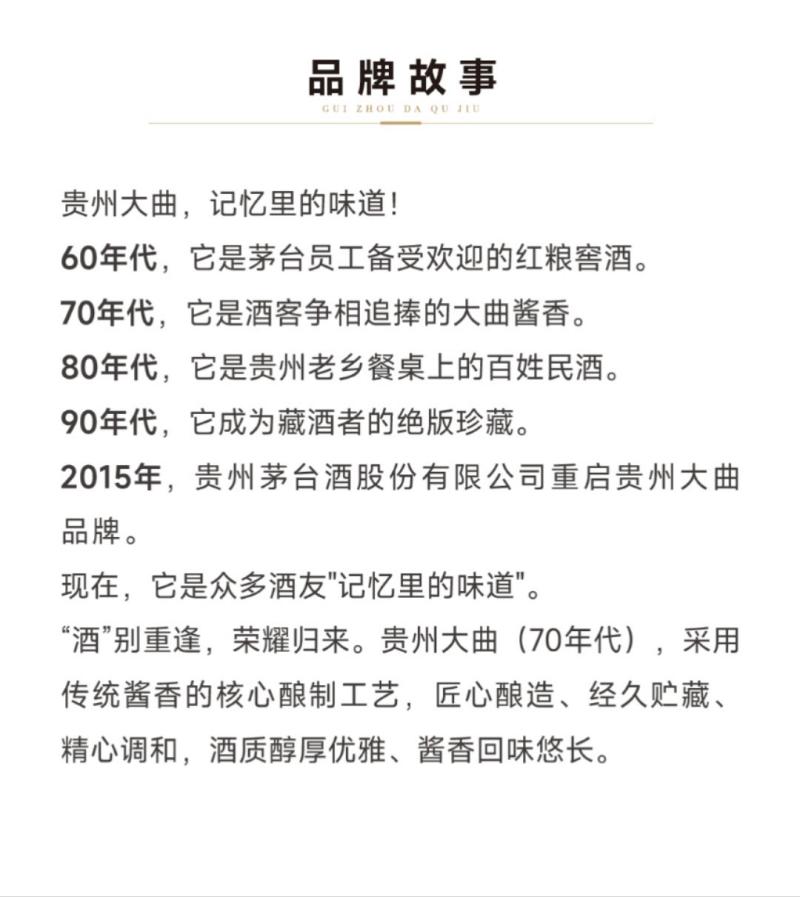 1974年,茅台酒厂同时推出了贵州大曲和茅台酒,但由于生产能力的限制,为确保茅台酒的市场供应,贵州大曲不得不暂时退出市场。这成为贵州大曲品牌历史的一段遗憾。贵州大曲在当时主要作为员工的福利酒和自供酒存在,因此也被誉为“茅台人自己喝的酒”。时隔多年,2007年贵州大曲重现市场,引发了广泛关注。2015年,贵州茅台酒股份有限公司重新启动了贵州大曲品牌,并作为茅台酱香酒系列中的核心品牌进行推出。它与华茅酒、王茅酒、赖茅酒、汉酱酒、仁酒、茅台王子酒、茅台迎宾酒共同构成了“一曲三茅四酱”的强大阵容。贵州大曲70年代凭借其独特的历史和品牌魅力,成为了茅台员工福利酒,重现了作为“茅台人自己喝的酒”的昔日风采。
