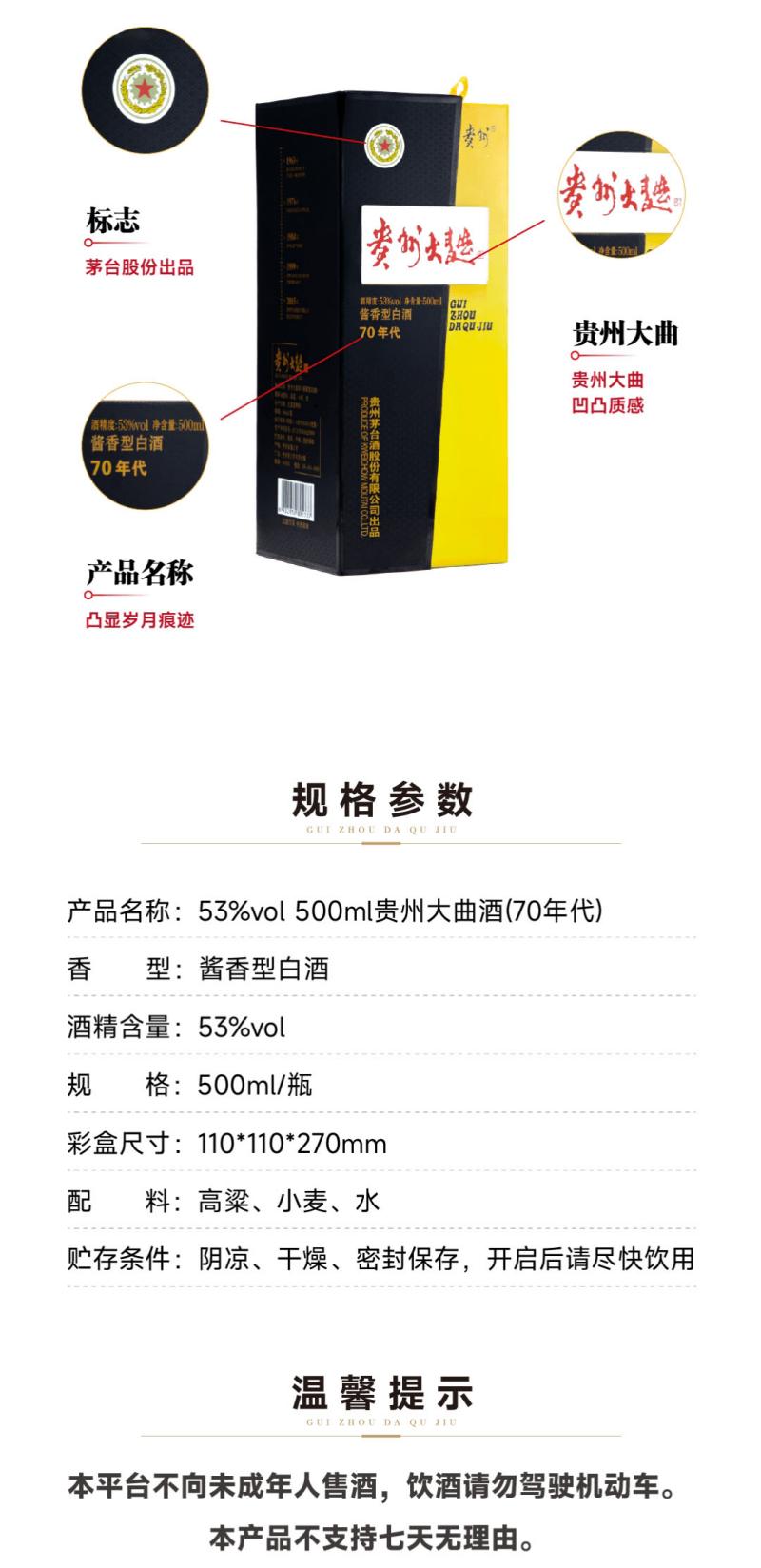 53度500ml的贵州大曲酒(70年代),由水、小麦、高粱制成,具有典型的酱香型53度酒精度数,规格为500ml,品牌为茅台,属于茅乡酒系列,原产于贵州省茅台镇,由贵州茅台酒厂集团生产,售价为798.00/瓶。