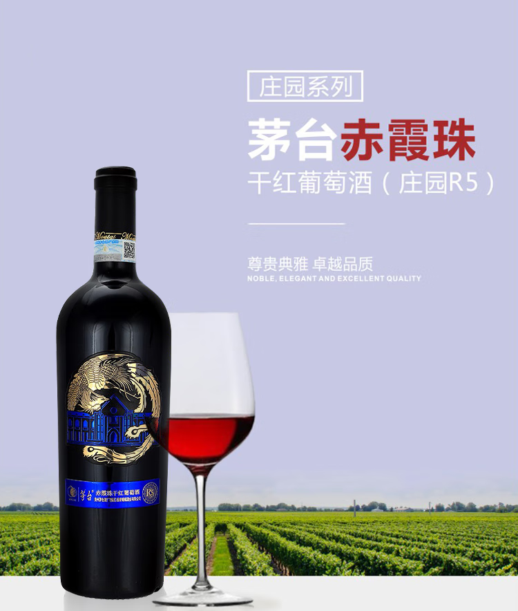 茅台赤霞珠干红葡萄酒R5,选用基地中平均树龄30年以上的赤霞珠葡萄,经过精心挑选和传统工艺酿造,再经橡木桶陈酿24个月,酒体呈现深宝石红色。